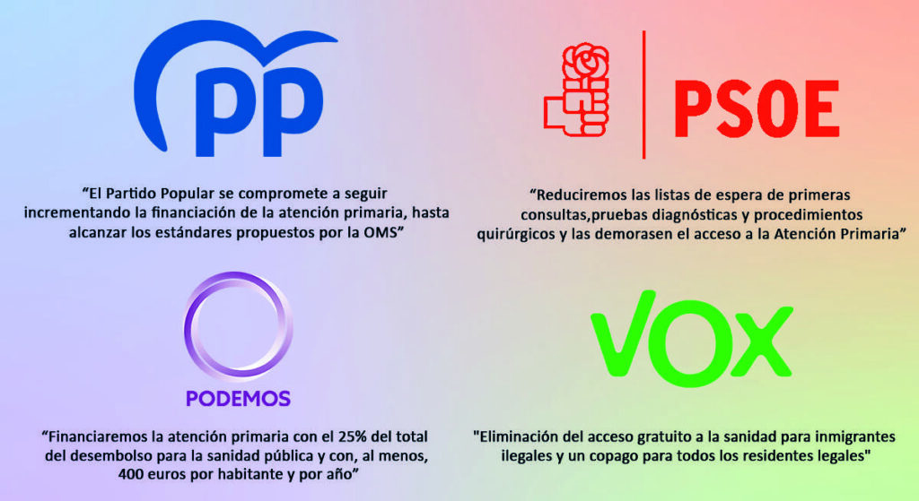 Los partidos políticos ya han hecho públicos sus programas electorales, entre ellos los que cuentan con más escaños a nivel nacional. En materia sanitaria, el Partido Popular pretende, en primer lugar, garantizar una financiación suficiente para responder a las demandas actuales del sistema sanitario público «partiendo de una ponderación realista en base al gasto real de los últimos años, y un reparto en base a la población protegida equivalente ponderada por el gasto de los diferentes grupos de edad», afirma el PP en el documento.