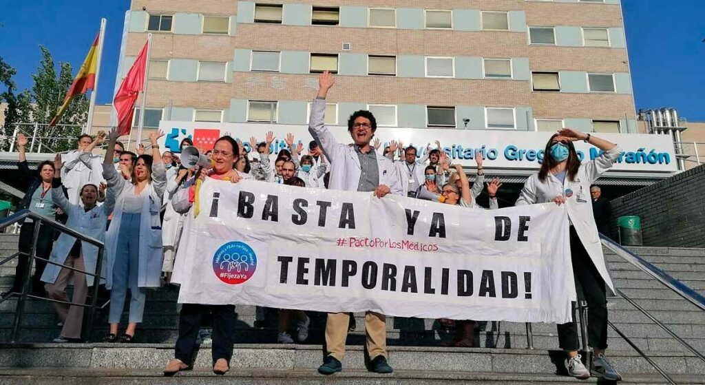 Tras la negativa del Gobierno de Isabel Díaz Ayuso «al abuso de la temporalidad» que afecta a más de 3.600 de estos profesionales, los médicos especialistas sin plaza fija retoman la huelga. Bajo el lema «Somos médicos, somos pacientes», la Plataforma de Médicos y Otros Facultativos (FEAS), la Asociación de Facultativos Especialistas de Madrid (AFEM) y el sindicato médico Amyts han convocado paros los martes y jueves del mes presente durante doce horas (de ocho de la mañana a ocho de la tarde).