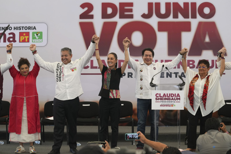 Según un promedio de las principales encuestas, realizado por la firma Oraculus, la oficialista Claudia Sheinbaum lidera con 55% de las preferencias, seguida por Xóchitl Gálvez con 33% y Jorge Álvarez Máynez con 12% de las intenciones de voto.
