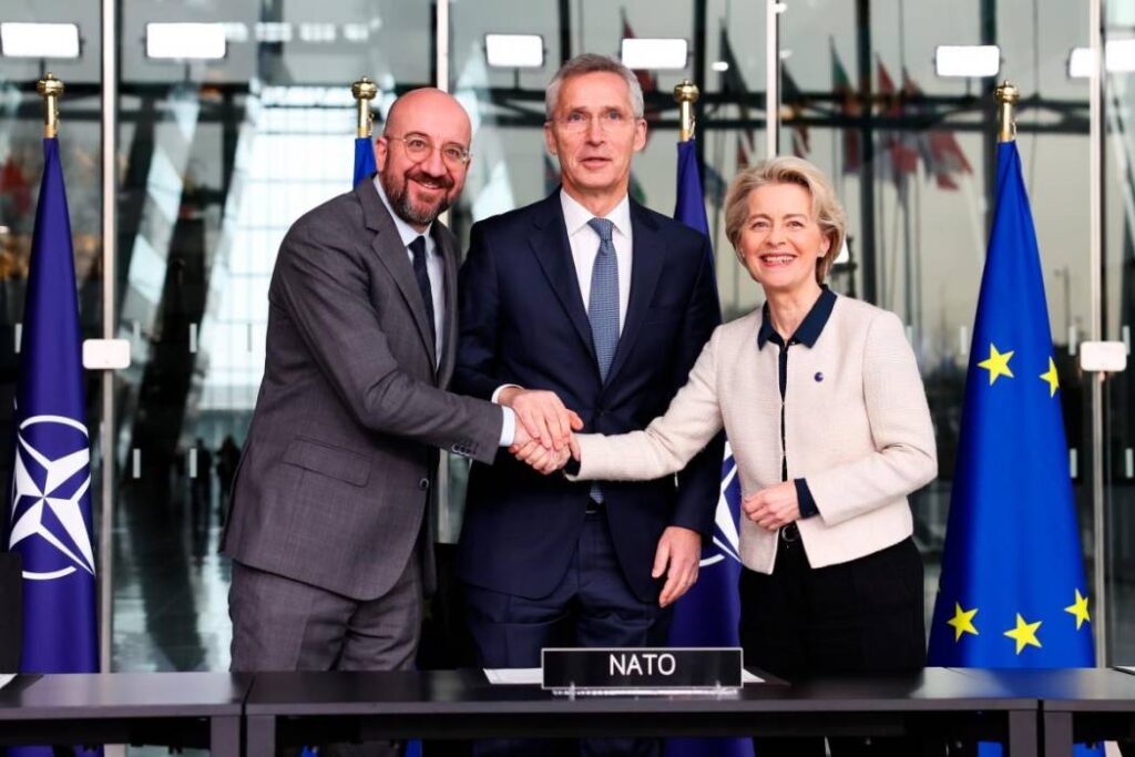 El secretario general de la OTAN, Jens Stoltenberg, y los presidentes de la Comisión Europea, Ursula von der Leyen, y del Consejo Europeo, Charles Michel, firmaron el documento en la sede de la Alianza Atlántica, en Bruselas.