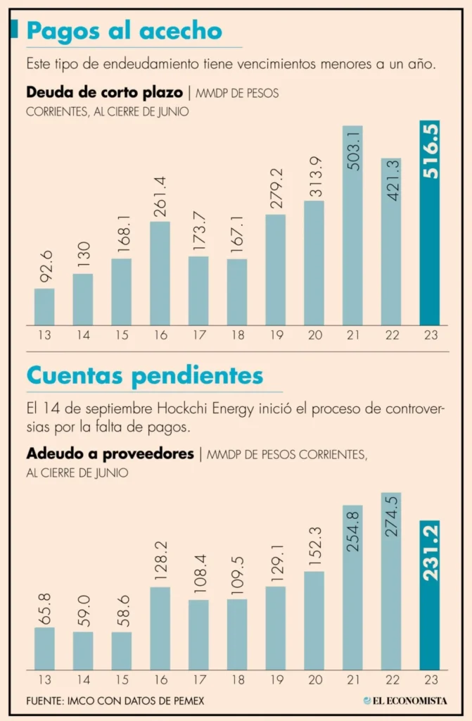 Petróleos Mexicanos (Pemex) tiene que pagar 747,614 millones de pesos en deuda de corto plazo, menos de un año, de los cuales 231,158 millones de pesos son para pago a proveedores y contratistas, y 516,456 millones de pesos es endeudamiento, de acuerdo con información de la petrolera al cierre del primer semestre del 2023.